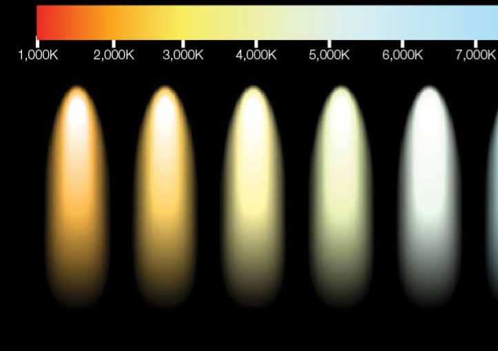 • هرچه عدد کلوین کمتر باشد، رنگ نور تمایل بیشتری به زرد یا گرم دارد (“Warm”). هرچه بیشتر باشد، رنگ نور سفیدتر یا حتی متمایل به آبی (“Cool”) میشود.